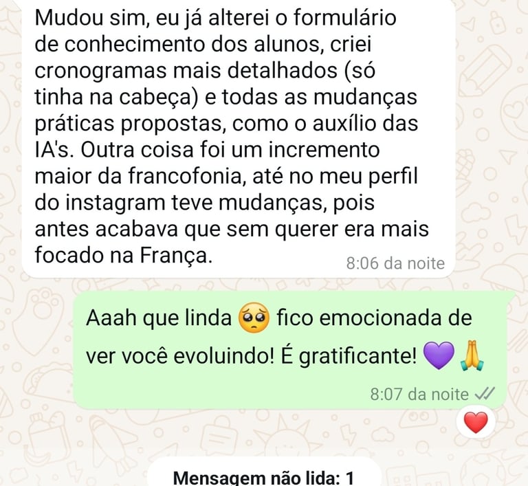 Ao longo da minha experiência como professora, percebi que a maioria dos livros didáticos disponíveis no mercado não atendia às necessidades específicas dos estudantes brasileiros. Essa realidade me motivou a desenvolver materiais autorais, utilizando conteúdos autênticos que dialogam com a cultura local e francófona (para além da França) que promovem um aprendizado significativo.